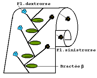 La cyme scorpioïde est issue d'une cyme bipare et antidrome (chaque fleur a ses pièces florales organisées en une spirale qui tourne en sens inverse de celpirale qui tourne en sens inverse de celle de la fleur précédente) ; le long de la cyme on a donc une succession de fleurs dites dextrorses figurées en bleu ou sinistrorses figurées en noir, toujours axillées par une bractée correspondant à la préfeuille